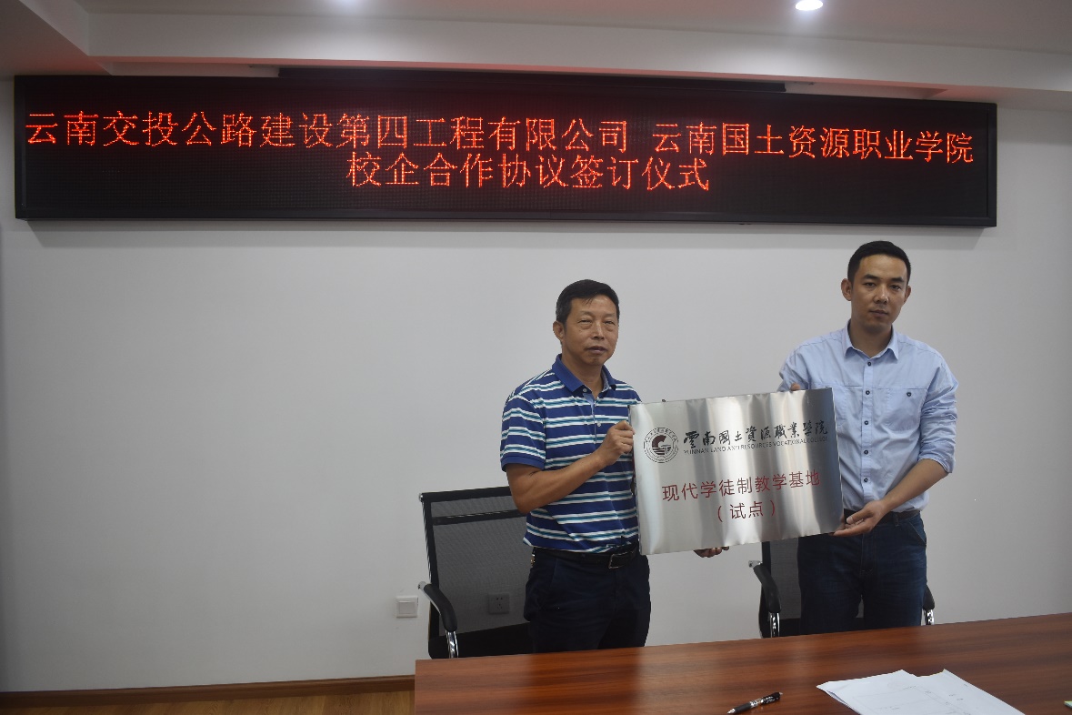 签约后举行授牌仪式,学院院长秦忠向企业负责人授予“云南国土资源职业学院现代学徒制教学基地(试点)”牌匾,双方表示未来将加大合作力度,多方位、多角度实现深度合作,促进共同发展。本次校企合作是双方深度合作的崭新起点,也必定会为各自的发展注入新的生机和活力。