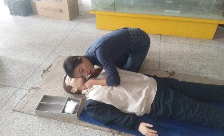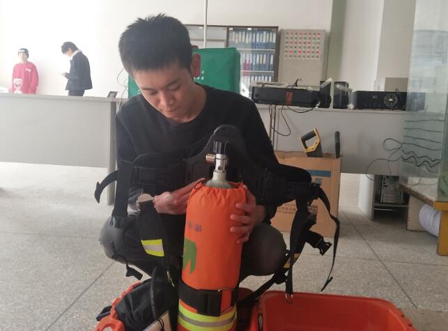 本次比赛项目由心肺复苏、正压式空气呼吸器的正确佩戴、创伤包扎三部分组成。在心肺复苏比赛过程中参赛选手仔细认真,沉着冷静犹如在真正的急救现场进行救护模拟,包括确认周边环境安全、确认伤员有无意识并拨打120要求急救、适度按压胸腔进行心肺复苏、清除口腔异物后口对口人工呼吸等急救工作。正压式空气呼吸器的佩戴,首先进行气压检查,其次进行气瓶、背带、呼吸管道、氧气管道、面罩的检查,最后进行佩戴,比赛过程中同学们都顺利完成着每一个步骤的操作。创伤包扎项目以抽签的方式进行,主要包括手指受伤、小臂受伤、手臂受伤、腹部受伤、脚背受伤、小腿受伤、大腿受伤7的部分,比赛过程中每一位选手都根据所抽到进行止血、包扎。