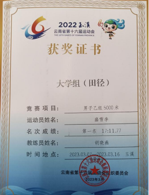 3月10日,我院2020级工业机器人专业学生盛雪李以17分11秒的优异成绩获得云南省第十六届运动会大学生男子乙组5000米冠军。