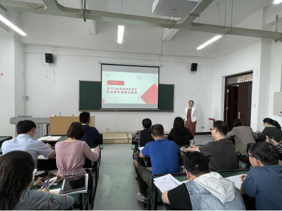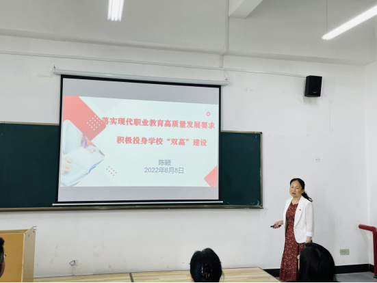 6月8日下午,党委副书记、校长陈颖以《落实现代职业教育高质量发展要求 积极投身学校“双高”建设》为题,结合成人网站免费观看的实际情况,给成人网站免费观看全体教职工讲授“双高”建设专题党课,成人网站免费观看党总支书记王春莲主持。